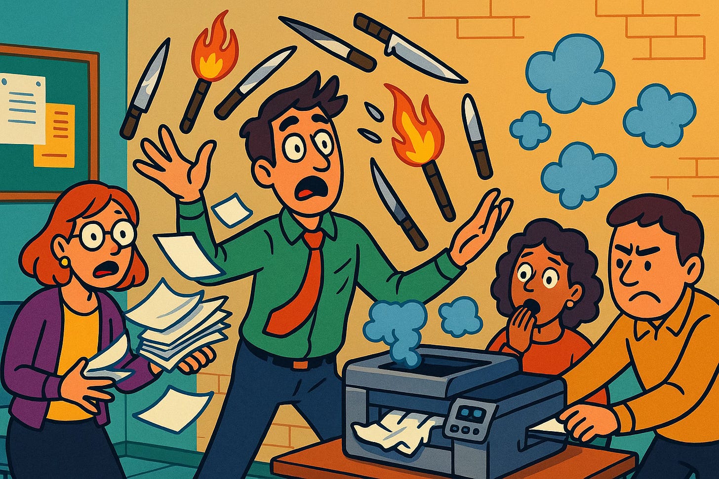 La docencia no es para nada difícil. Al menos no lo es comparada con hacer malabares con antorchas y cuchillos mientras un tercero te arroja una tras otra las hojas de una pila de documentos y formularios que tienes que completar —todo esto sin dejar caer las antorchas y los cuchillos. ¿Y cómo es que cobran vida estos documentos? Pues claro, con una impresora.