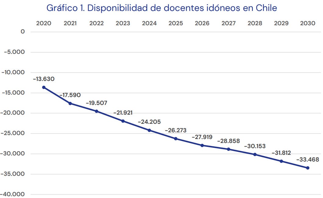 Pongamos las cosas en contexto: Chile acumula un extenso historial en términos de insuficiencia de profesionales de la educación, más específicamente profesores. Hoy los expertos estiman que para 2025 podrían faltar algo así como 32 mil profesores, lo que no es de extrañar considerando que entre 2005 y 2020 la matrícula de primer año en pedagogías (excepto párvulos y diferencial) ha caído en promedio un 4% anual y que, además, la deserción laboral docente alcanza en promedio el 4,1% anual. En términos absolutos, esto significa que en promedio 8 mil docentes salen del sistema en el transcurso de un año. Las razones para esta decadencia no son desconocidas para nadie y las medidas que se intentaron a través de la creación de la Beca Vocación de Profesor y la Carrera Docente no han cambiado en absoluto la proyección. La Carrera Docente "se pensó para atraer a más personas de mayores habilidades académicas a la pedagogía, pero ese propósito fracasó", dice el ex ministro de educación Harald Beyer.